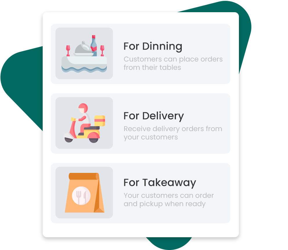 Your customers can place orders for delivery, Takeaway or even dine-in from their tables.